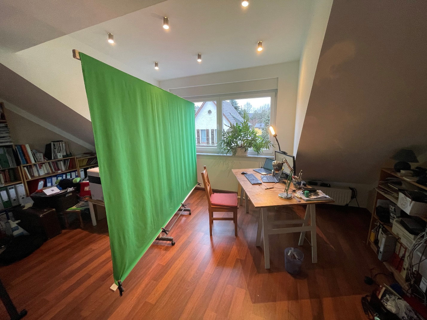 So sieht es wirklich bei mir aus. Und ihr erkennt auch, was ich mit Platz meine: Der Greenscreen ist raumfüllend. Entsprechenden Stoff gibt es in jeglichen Größen für kleines Geld. Bei mir hat ein Garderobenständer mit Dachlatten als Aufhängung ausgereicht. Die Dachlatten habe ich mit Kabelbindern am Ständer befestigt. Oben ist der grüne Stoff an der Dachlatte befestigt, unten habe ich etwas Gewicht angehängt, damit er gut fällt – fertig. Andere Konstruktionen sind natürlich denkbar.