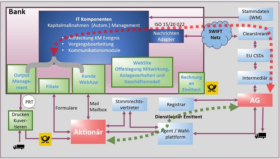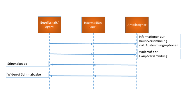 Zusammengefasst bedeutet dies, dass die Kreditinstitute die gesamte Kommunikation zwischen Inhaberaktionären, bestimmten Namensaktionären und Gesellschaften übernehmen. Anlässe, die eine Kommunikation notwendig machen, können sein: