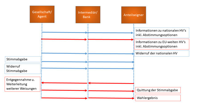Die Änderungen werden anhand des Hauptversammlungsprozesses deutlich. Heute werden Informationen zur Hauptversammlung durch die Gesellschaft im Bundesanzeiger veröffentlicht, die dann von bestimmten Informationsdienstleistern (z. B. WM Datenservice) publiziert werden. Die Dienstleister leiten diese dann weiter über die Zentralverwahrer an die angeschlossenen Depotbanken. Parallel kann auch der direkte Zugang zu WM Datenservice genutzt werden. Nach Überprüfung der Berechtigung des Aktionärs werden die Daten überwiegend papierhaft an die entsprechen Aktionäre übersendet. Informationen von Gesellschaften aus EU-Mitgliedstaaten stehen heute schon zur Verfügung, werden jedoch nicht von allen Depotbanken an die Aktionäre weitergegeben.
