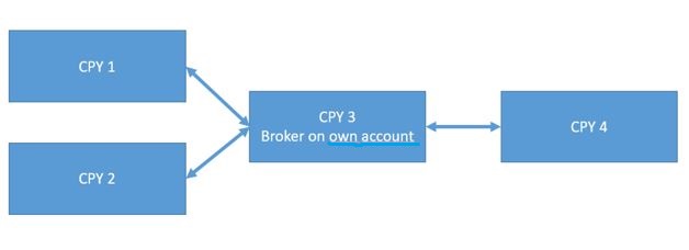 CPYs 1, 2 und 4 melden als CPY die Nummer 3. CPY 3 meldet als CPYs die Nummern 1, 2, 4. Das Broker Feld bleibt dabei leer. Mögliche Rollenverteilungen und Meldepflichten in anderen Tri-Party Konstellationen sind dargelegt. Die Rolle des Brokers birgt den Vorteil in sich, verschiedene Geschäfte zusammenfassen zu können und somit clientseitig nur einen Loan und Collateral leg und Margin Call abbilden zu können. Die Serviceleistung des Brokers besteht also in der Optimierung der Client Positionen.